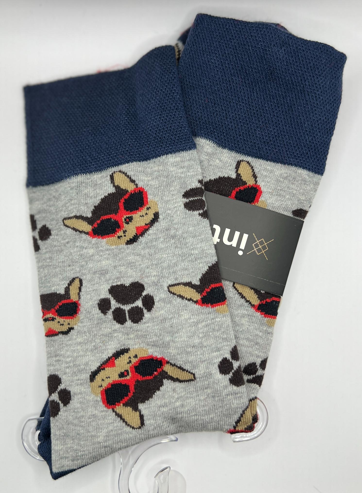 Ponožky šedé barvy se špičkou, patou a lemem v tmavě modré barvě. Motiv frajírků francouzských buldočků ve slunečních brýlích.