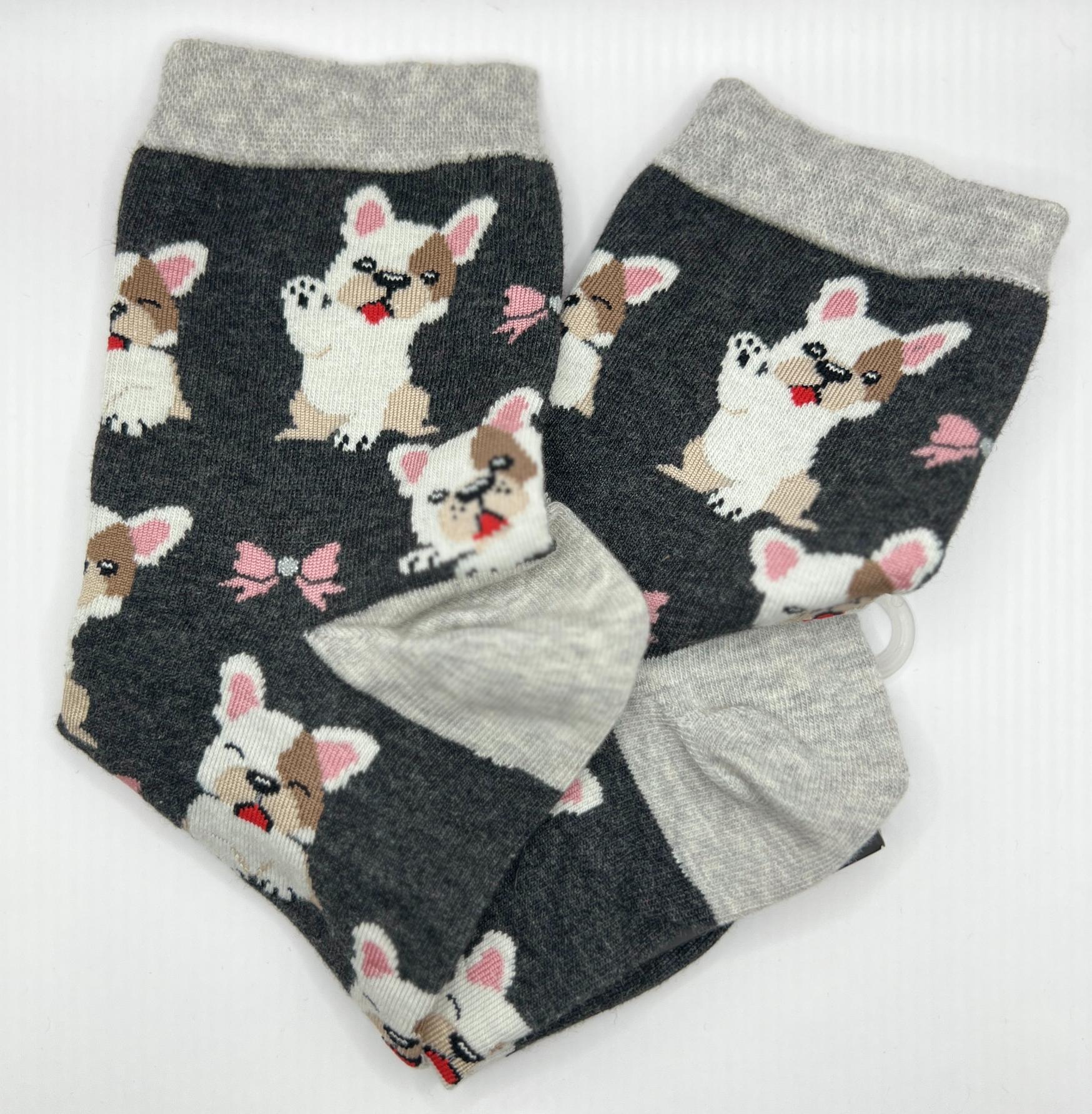 Ponožky tmavě šedé barvy s lemem a špičkou ve světle šedé a s béžovými buldočky.