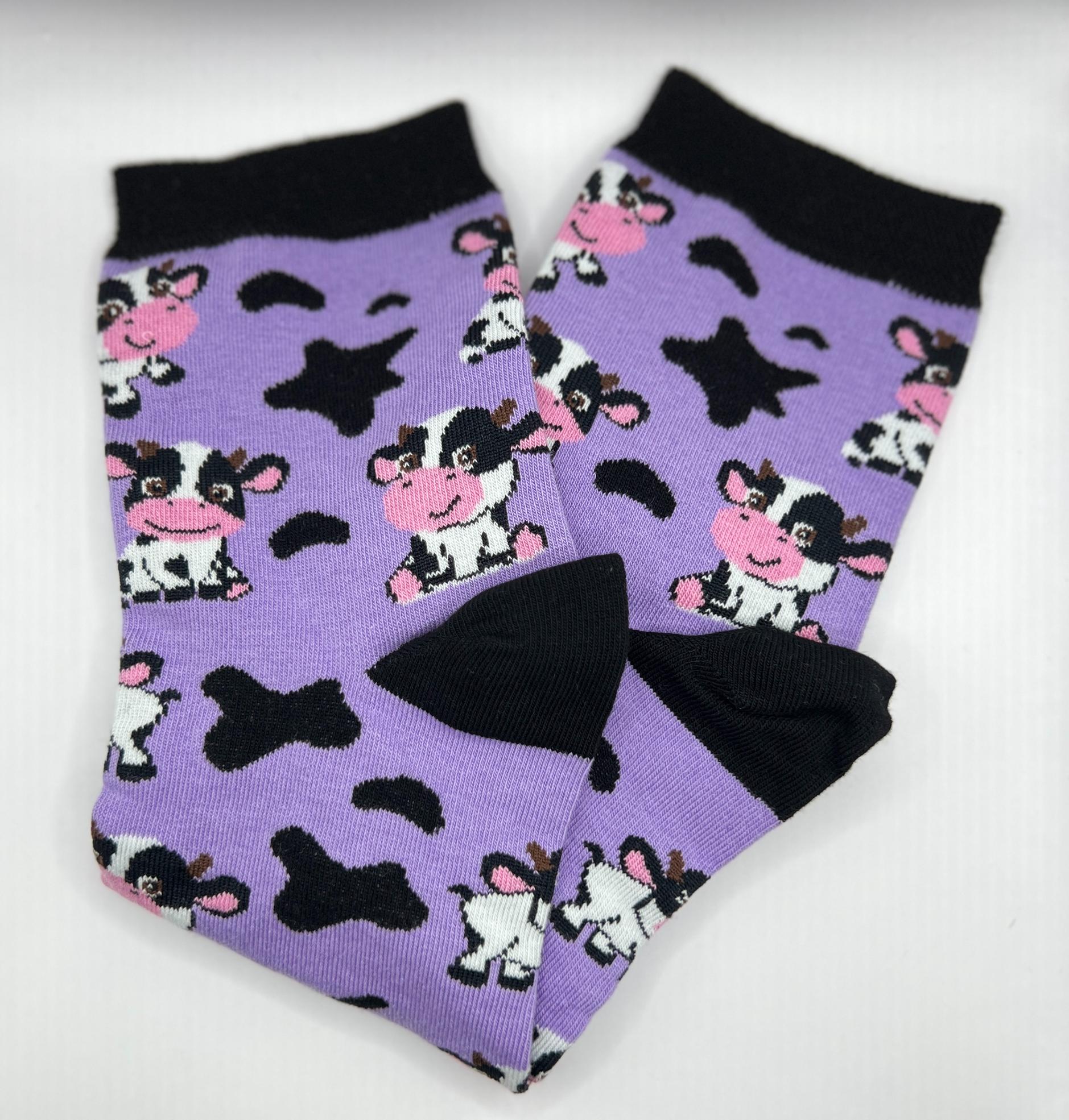 Ponožky fialové barvy s lemem, patou a špičkou v černé barvě. Motiv veselých kraviček.
