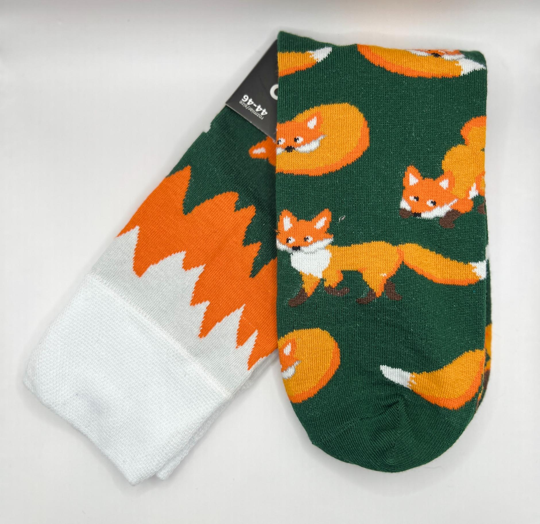 Ponožky tmavě zelené barvy s lemem v bílé barvě. Motiv veselých lištiček.