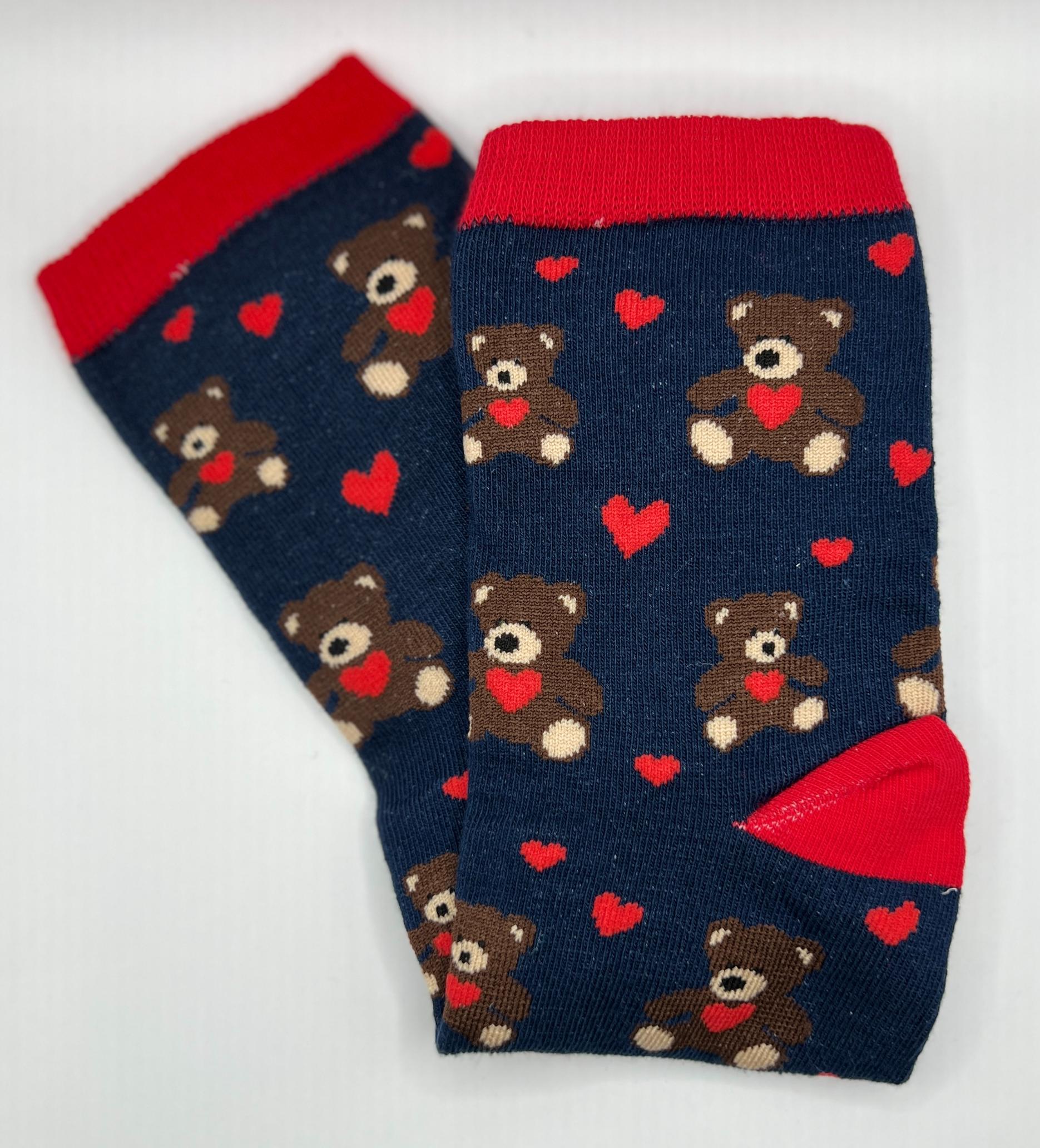 Ponožky tmavě modré barvy se špičkou, patou a lemem v červené barvě. Motiv tmavě hnědých medvídků a červených srdíček.