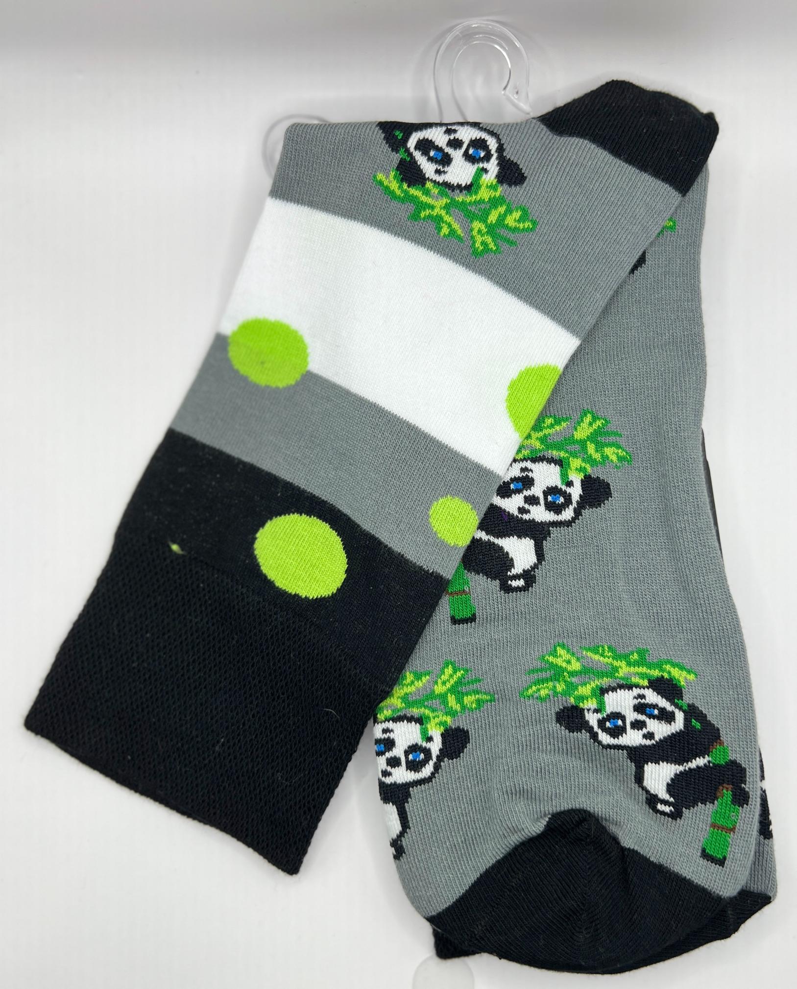 Ponožky šedé barvy s vrškem bíle a šedě proužkovaným, s lemem a špičkou v černé barvě. Motiv medvídka pandy na bambusu.