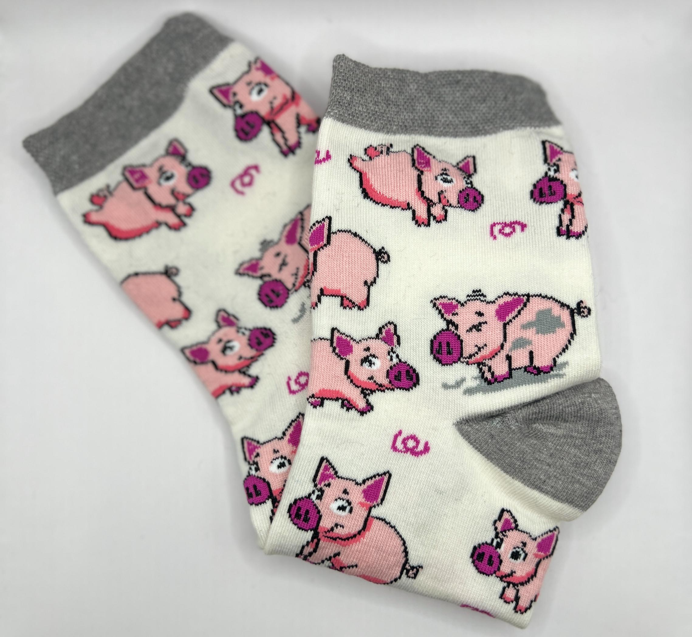 Ponožky krémové barvy s šedým lemem a špičkou, s postavičkami veselých prasátek.