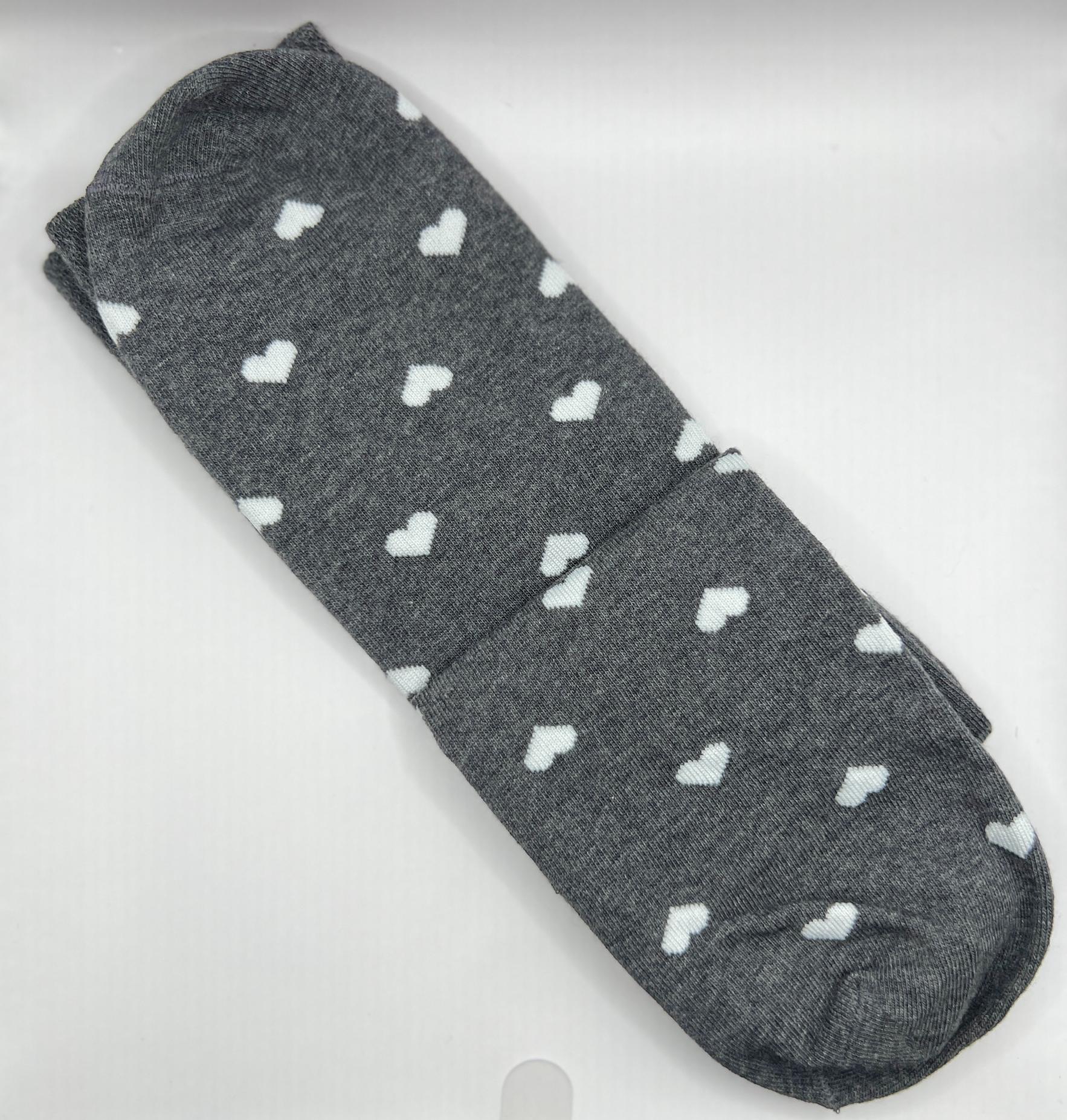 Ponožky v šedé barvě s motivem bílých srdíček.