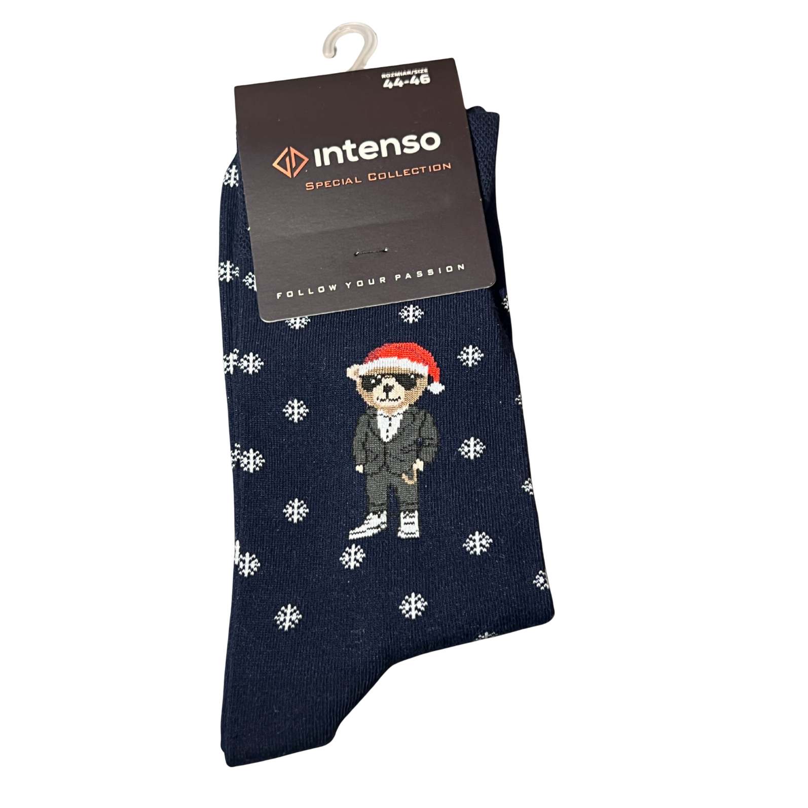 Vánoční ponožky tmavěmodré barvy s motivem frajerského medvěda v brýlích a vánoční čepičce.