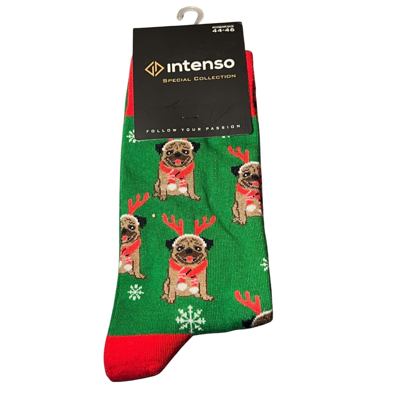Vánoční ponožky zelené barvy s motivem mopsíka se sobími parohy.   Materiál: bavlna Složení: 78% bavlna, 20% polyamid, 2% spandex Praní: 30°C Žehlení: ne Sušička: ne   celý popis